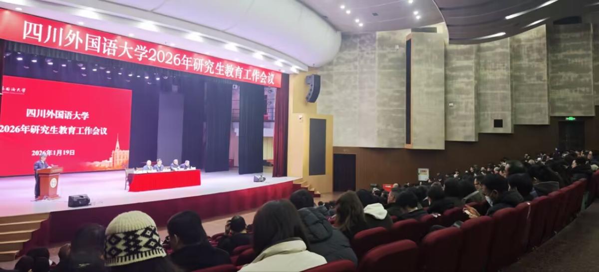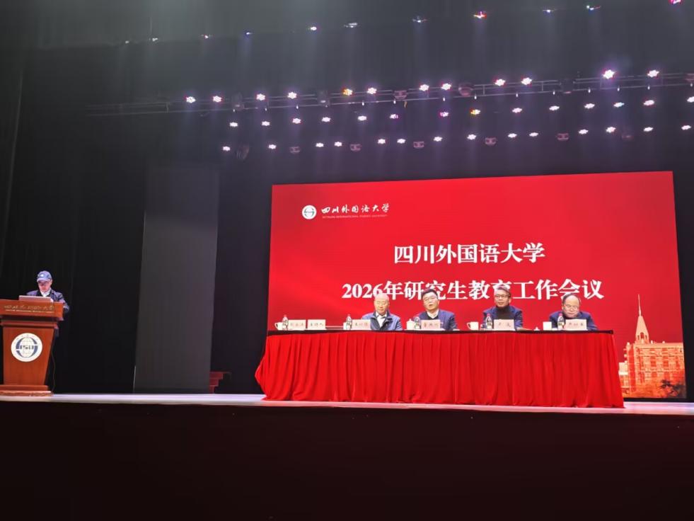 1月19日上午,四川外国语大学2026年研究生教育工作会议在东区大礼堂召开。校长董洪川,副校长卢波、王仁强、严功军、胡安江出席会议。各研究生培养学院负责人、分管领导、研究生导师、任课教师、辅导员、教学秘书及行业导师代表近400人参会。会议由副校长胡安江主持。